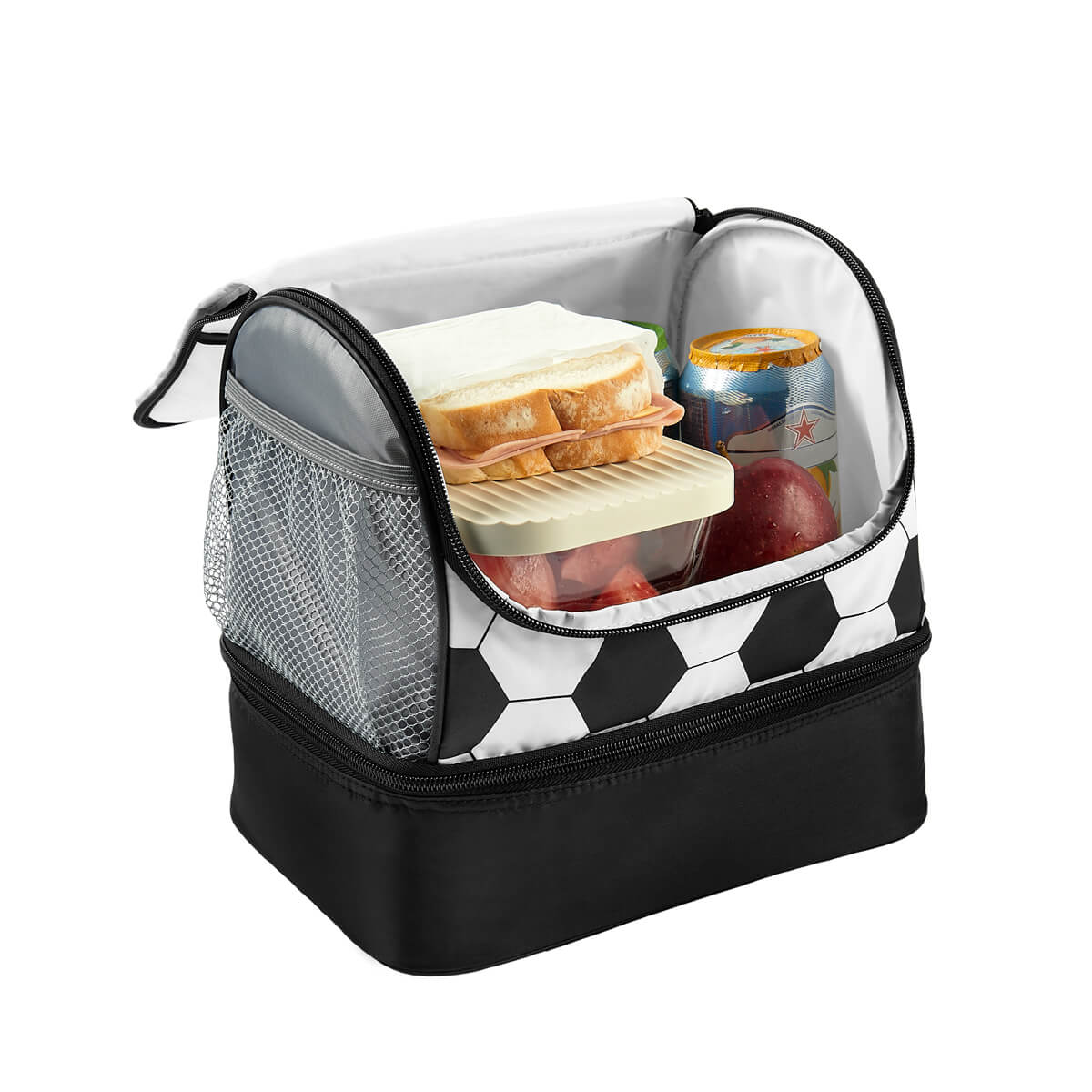 Lonchera con interior plastificado. Doble compartimento con cierre. Bolsa lateral de red y asa de agarre superior. Capacidad para 9 latas. 24 X 24 X 17 CM