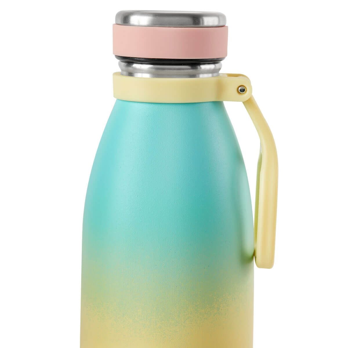 Doble pared. Cerrado al vacío. Pared interna y externa acero inoxidable. Terminado rugoso color degradado. Tapa de rosca. Cuenta con asa. Mantiene temperatura caliente 8 hrs y temperatura fría 12 hrs aproximadamente. Incluye caja individual. Capacidad: 750ml